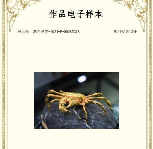 为了证明自身作品的原创性,吴文胜还向视频发布方提供了自己的版权证书等关键材料。经过仔细比对,对方认为山姆超市售卖的黄金螃蟹确实极有可能是抄袭了他的作品,随即在文案中补充了吴文胜的名字,并注明其为原创作者。